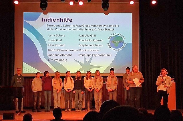 Mit einer Ehrungsveranstaltung am 29. Januar 2026 würdigte das Anno-Gymnasium in Siegburg das außerunterrichtliche Engagement ihrer Schülerinnen und Schüler. Unter dem Titel „Glanzlichter am Anno-Gymnasium – Leistungen, die leuchten“ wurden in der Aula mehr als 100 Jugendliche für ihren besonderen Einsatz ausgezeichnet. Bei diesem festlichen Anlass wurde die Indienhilfe AG für ihr fortlaufendes soziales Engagement ausgezeichnet. Mit über 18.000 € war das Gymnasium im Jahr 2025 wieder größter Spender der Indienhilfe Siegburg. Neben dem Sponsorenlauf, der 14.000 € erbrachte, wurde der Rest durch Aktionen der AG sowie Spenden von Lehrkräften erwirtschaftet. Wir bedanken uns herzlich bei allen Engagierten und gratulieren zur Auszeichnung.
